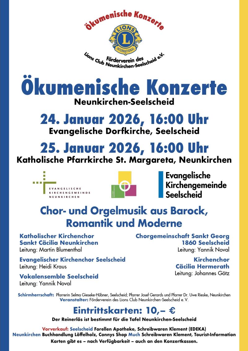 Evangelische Dorfkirche Seelscheid Pfarrer-Julius-Smend-Platz 3, Neunkirchen-Seelscheid, NRW, DeutschlandÖkumenische Konzerte Neunkirchen-Seelscheid Datum: 24.01.2026 Uhrzeit: 16:00 Uhr Veranstaltungsort: Evangelische Dorfkirche Seelscheid Veranstalter: Förderverein des Lions Club Neunkirchen-Seelscheid e. V. Ein vielseitiges Programm mit Chor- und Orgelmusik aus Barock, Romantik und Moderne wird gestaltet von • Katholischer Kirchenchor Sankt Cäcilia Neunkirchen, Leitung Martin Blumenthal • Chorgemeinschaft Sankt Georg 1860 Seelscheid, Leitung Yannik Noval • Evangelischer […]